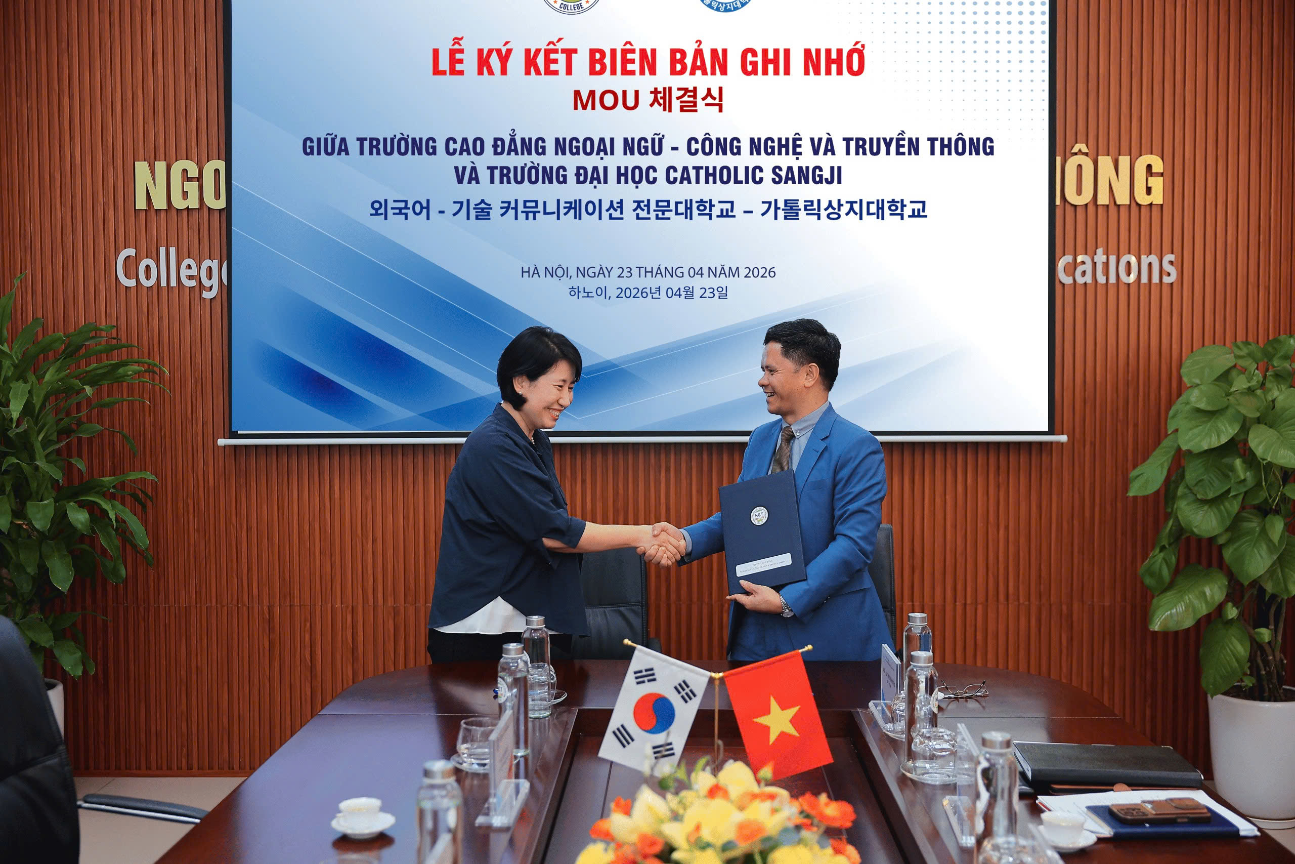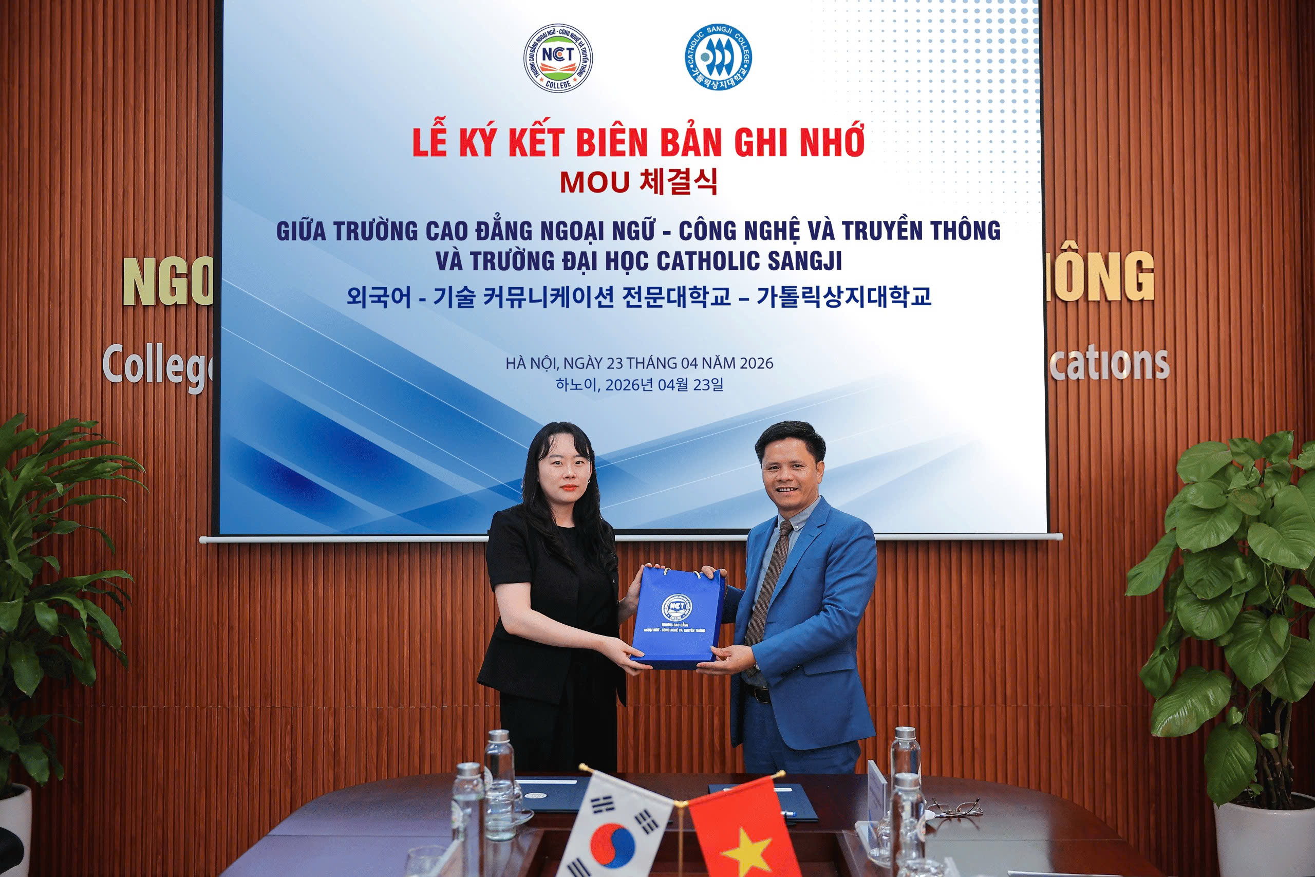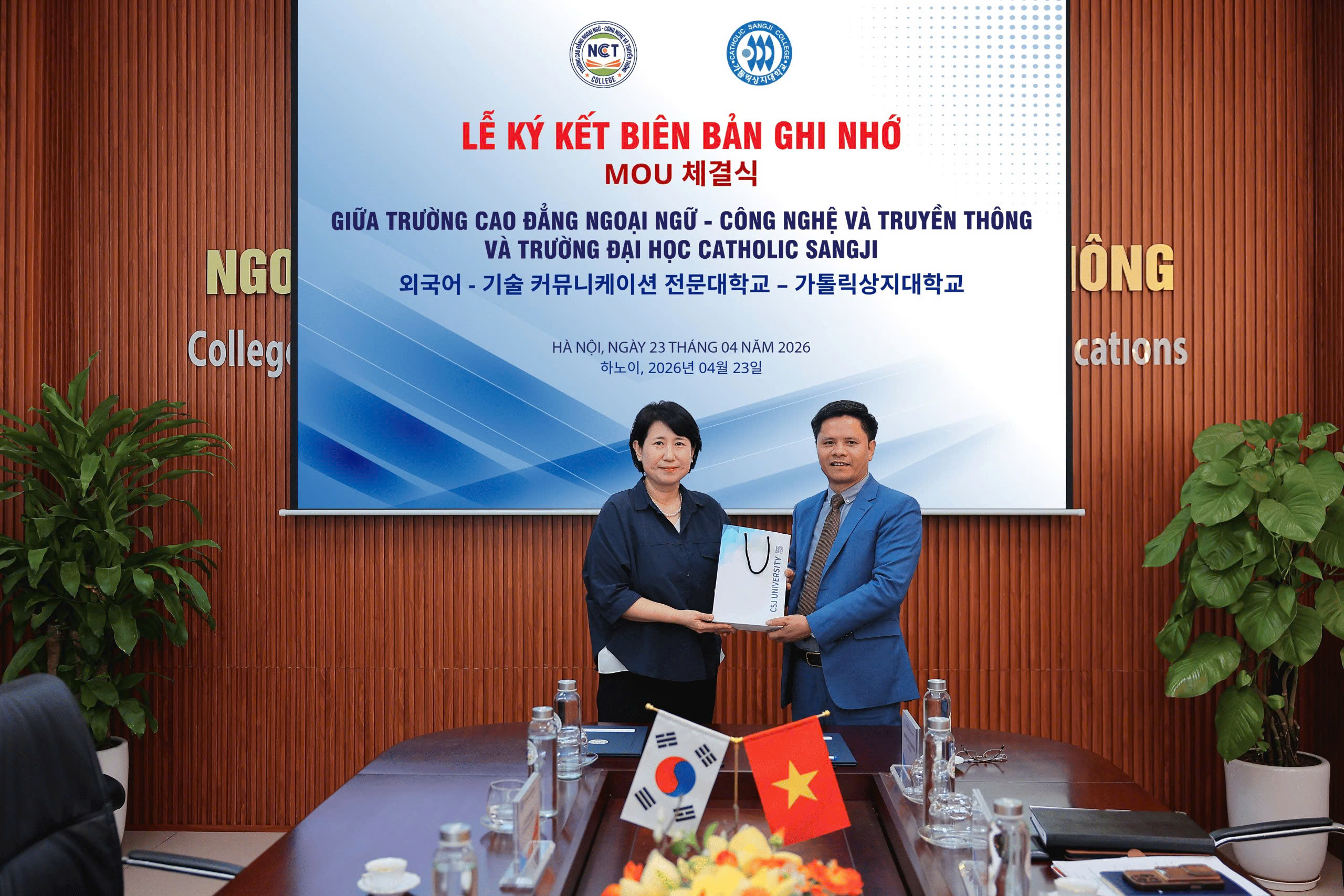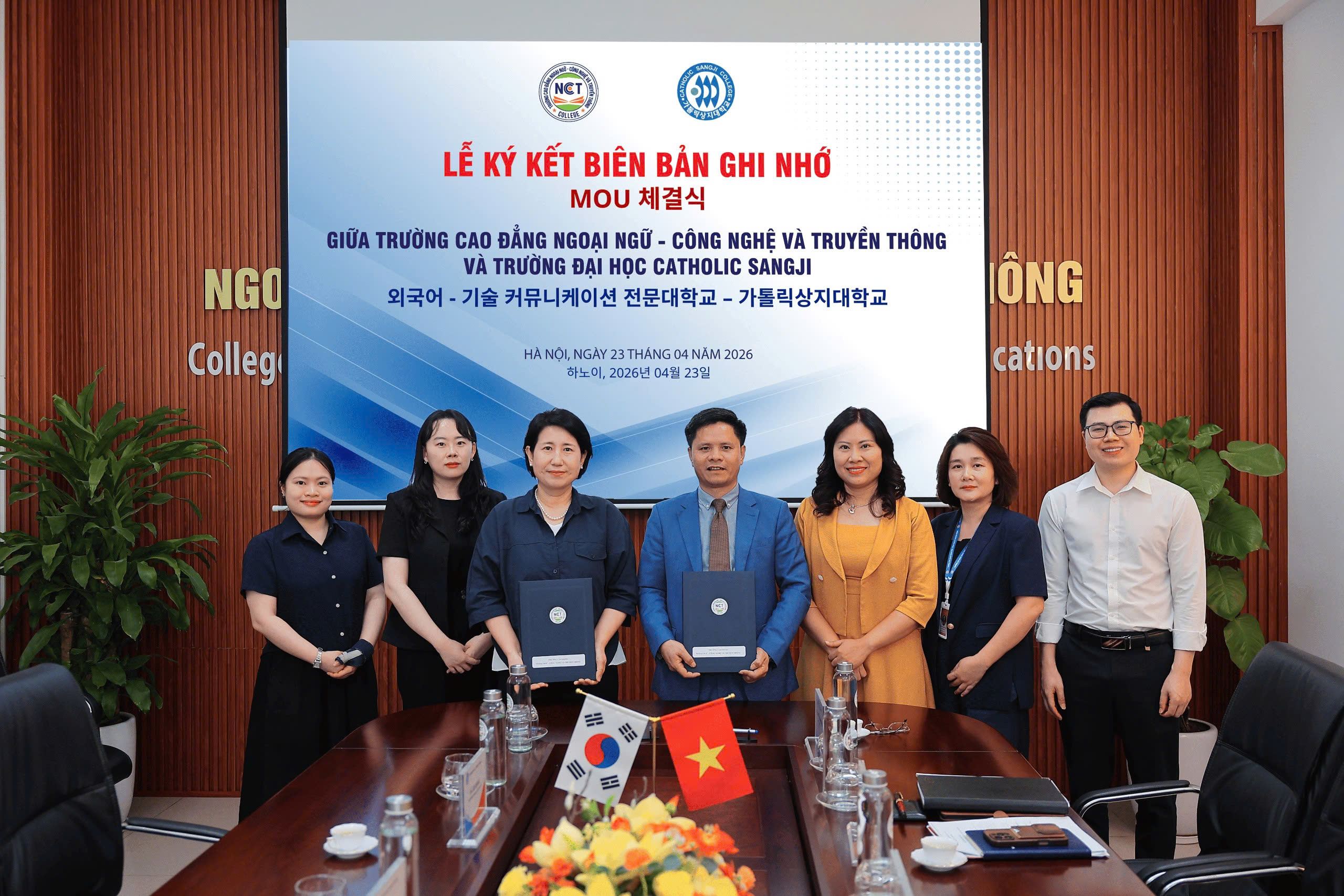 Chiều ngày 23/04/2026, Trường Cao đẳng Ngoại ngữ – Công nghệ và Truyền thông (NCT College) đã chính thức ký kết Biên bản ghi nhớ hợp tác với Trường Đại học Catholic Sangji (Hàn Quốc), mở ra nhiều cơ hội hợp tác trong đào tạo và nghiên cứu giữa hai trường.