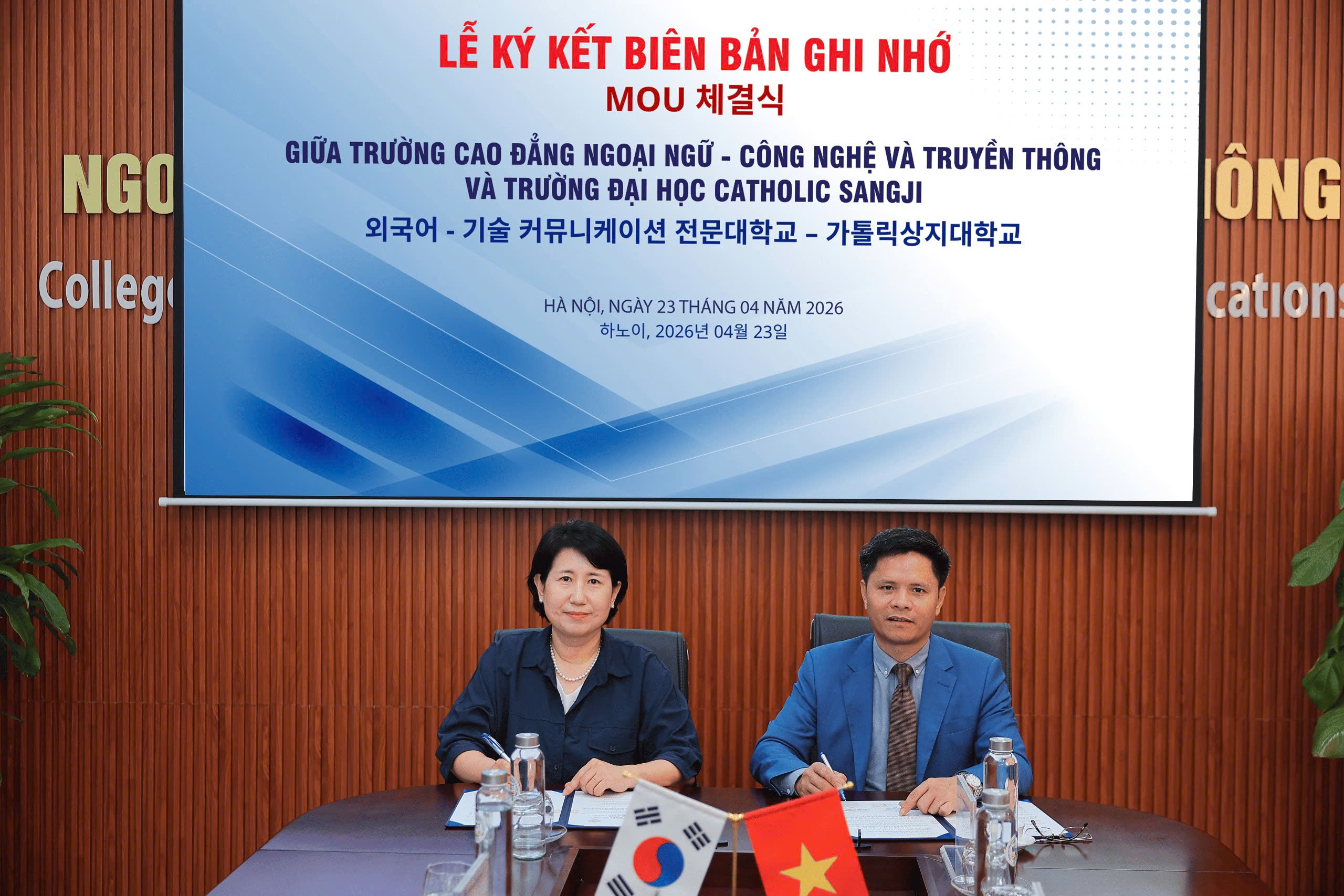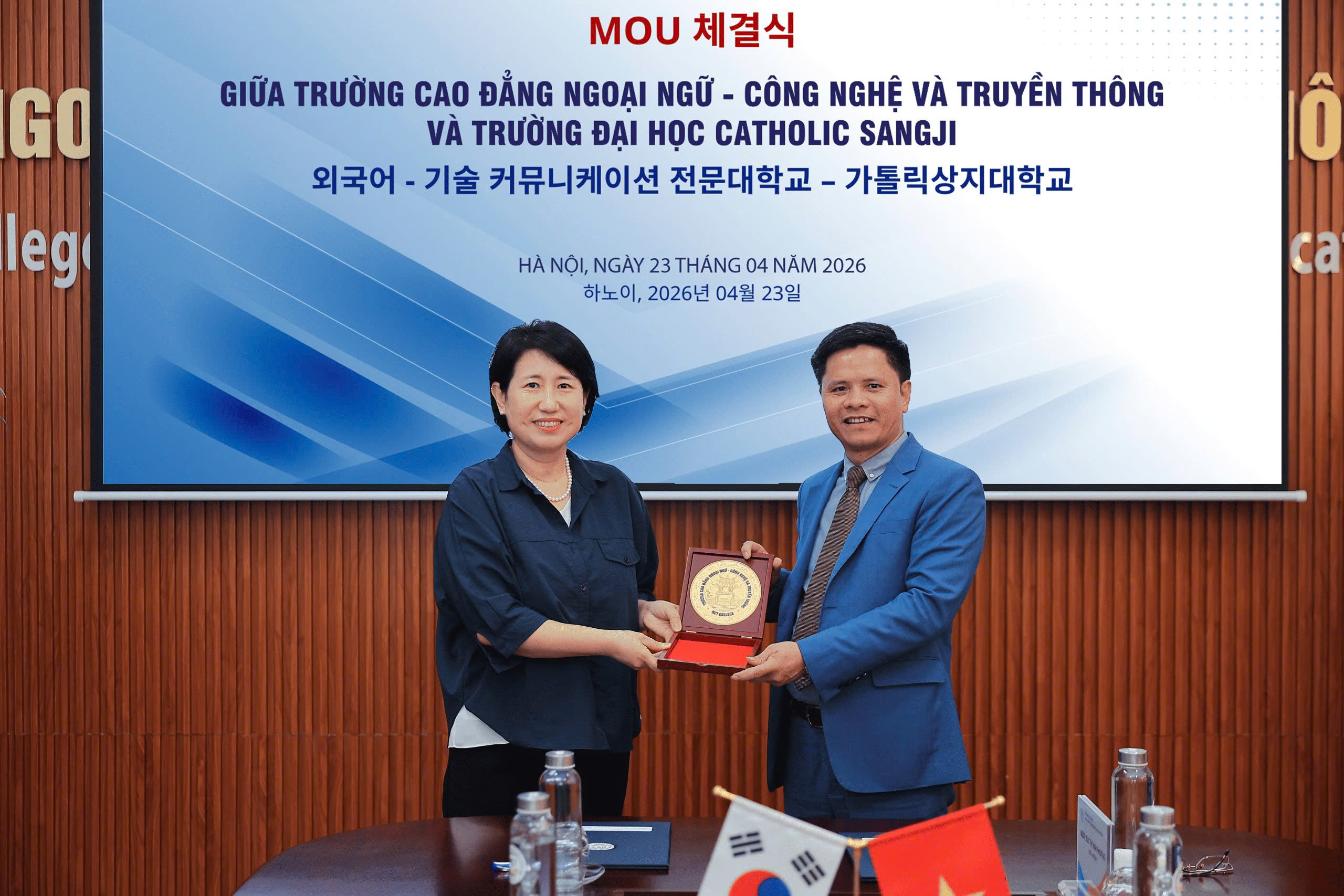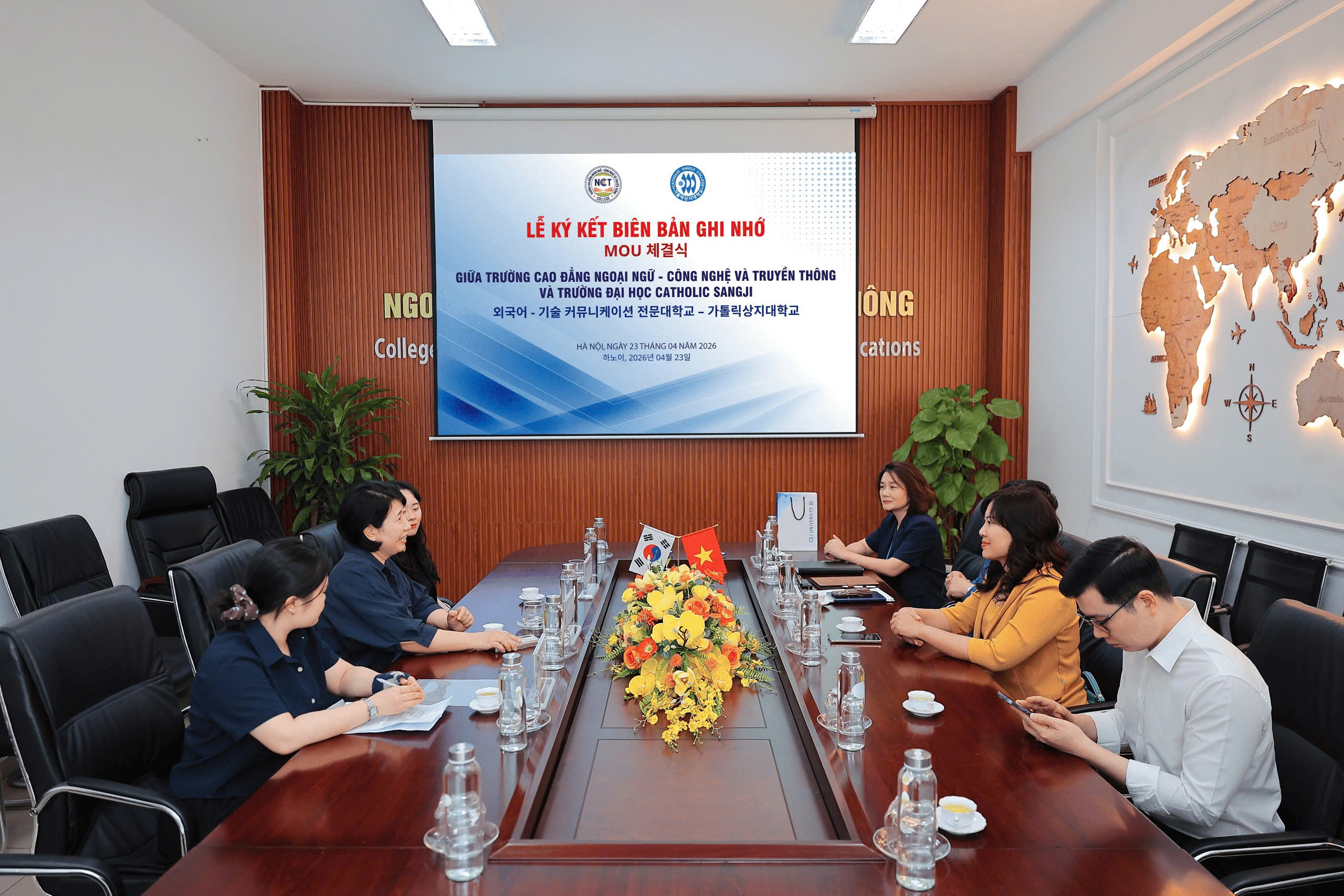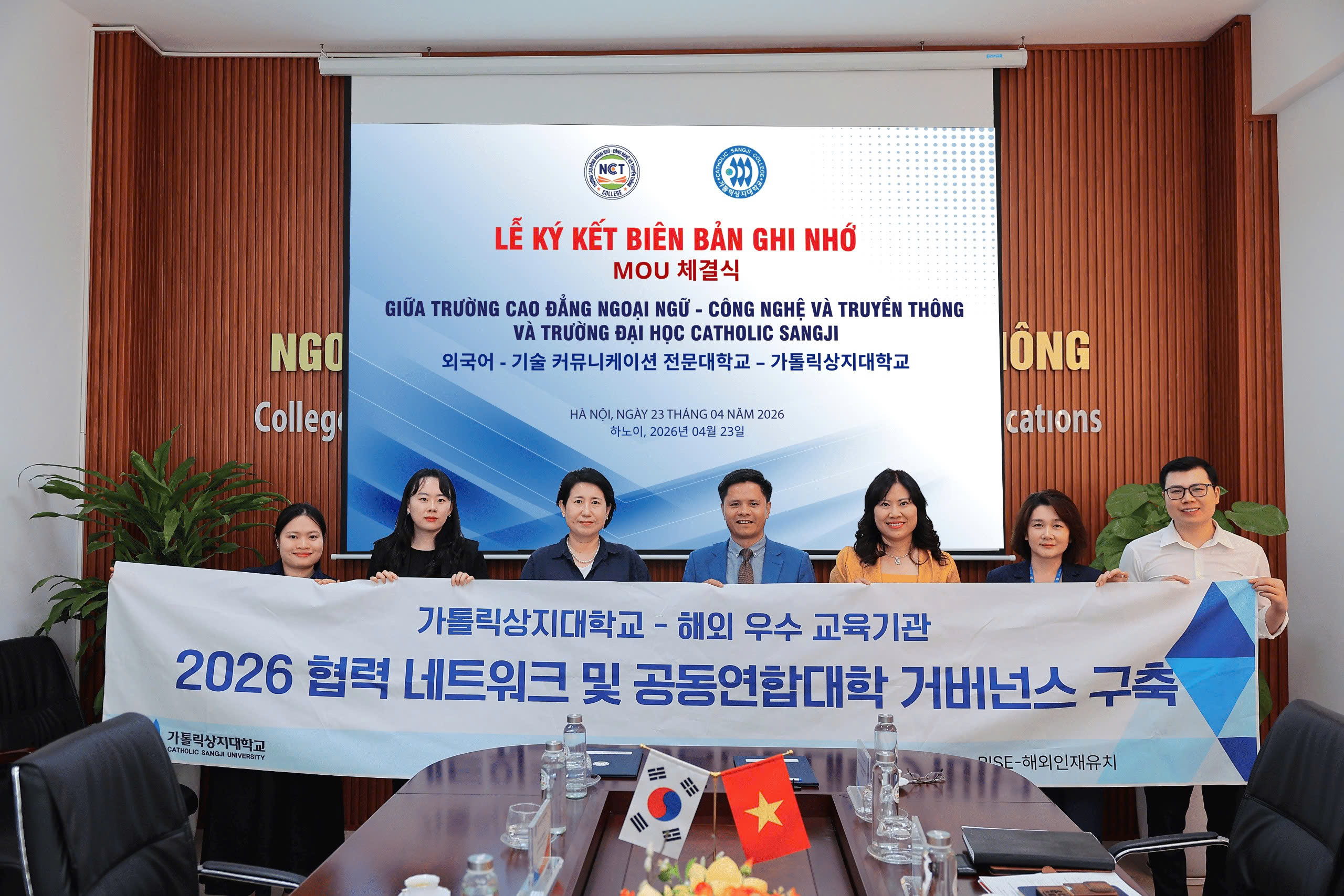 Chiều ngày 23/04/2026, Trường Cao đẳng Ngoại ngữ – Công nghệ và Truyền thông (NCT College) đã chính thức ký kết Biên bản ghi nhớ hợp tác với Trường Đại học Catholic Sangji (Hàn Quốc), mở ra nhiều cơ hội hợp tác trong đào tạo và nghiên cứu giữa hai trường.