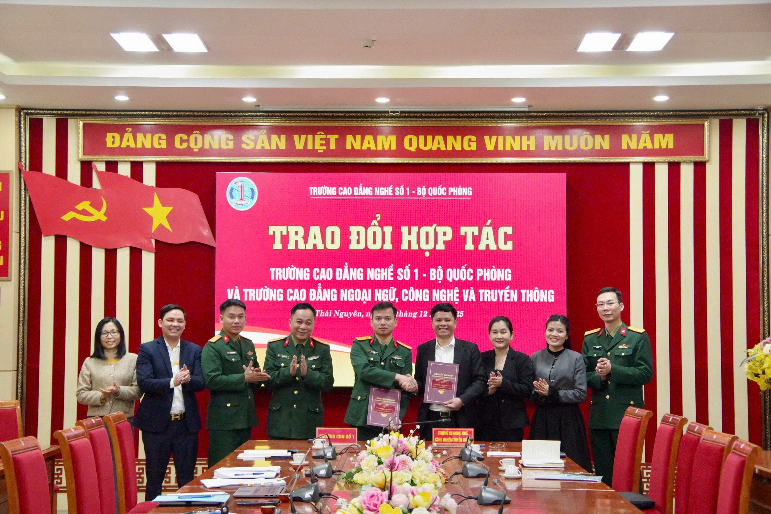 Ngày 31/12/2025, Trường Cao đẳng Nghề số 1 – Bộ Quốc Phòng đã long trọng tổ chức buổi làm việc và ký kết thỏa thuận hợp tác với Trường Cao đẳng Ngoại ngữ – Công nghệ và Truyền thông (NCT).