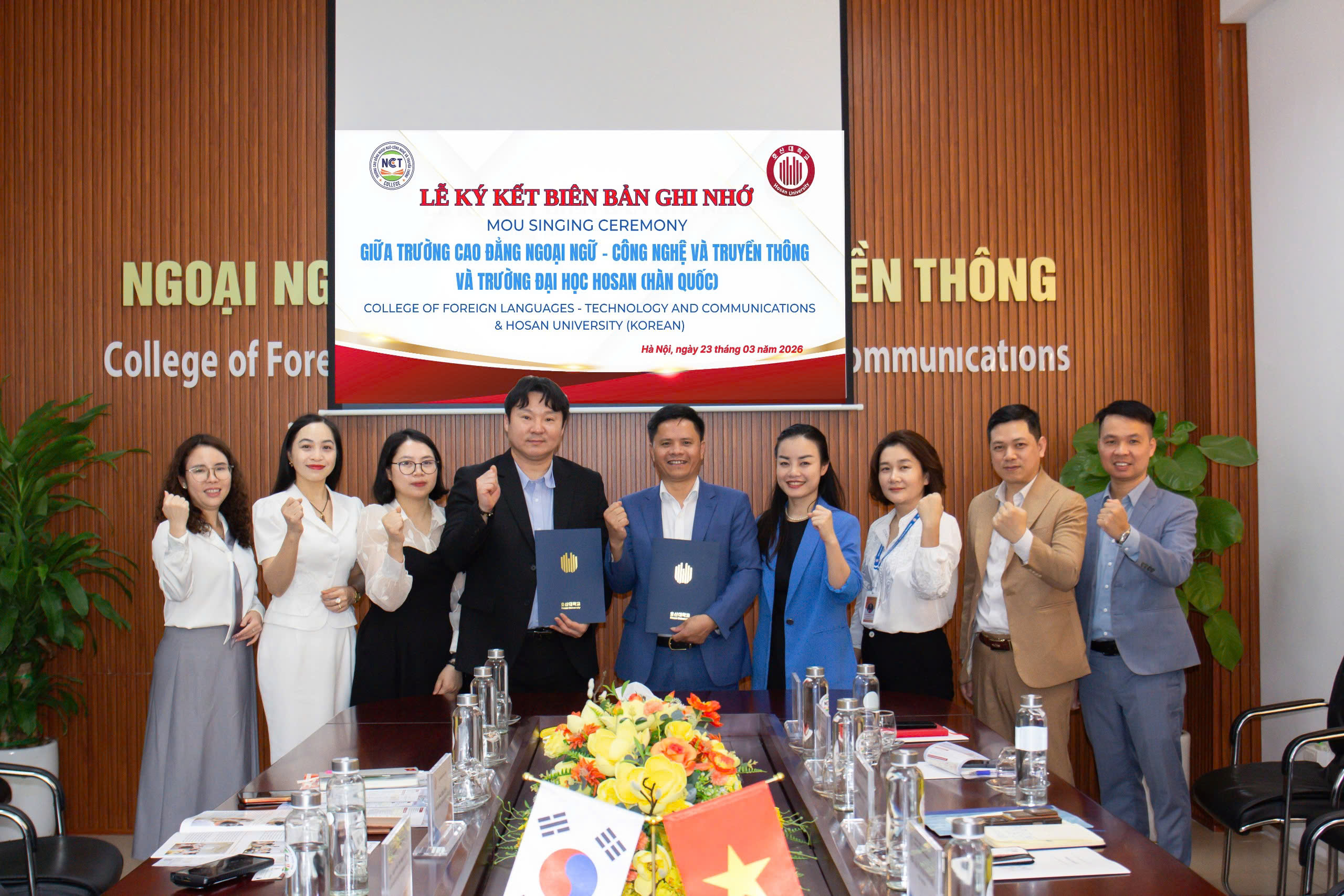 Chiều ngày 23/03/2026, Trường Cao đẳng Ngoại ngữ – Công nghệ và Truyền thông (NCT College) đã Lễ ký kết Biên bản ghi nhớ hợp tác (MOU) với Hosan University (Hàn Quốc). Sự kiện đánh dấu bước phát triển mới trong chiến lược mở rộng hợp tác quốc tế, đồng thời khẳng định định hướng đào tạo gắn với hội nhập toàn cầu của Nhà trường.