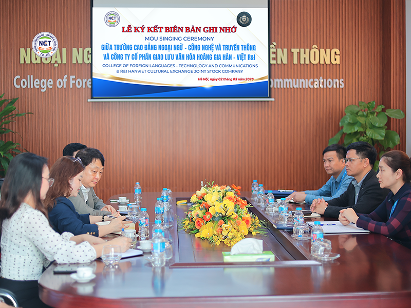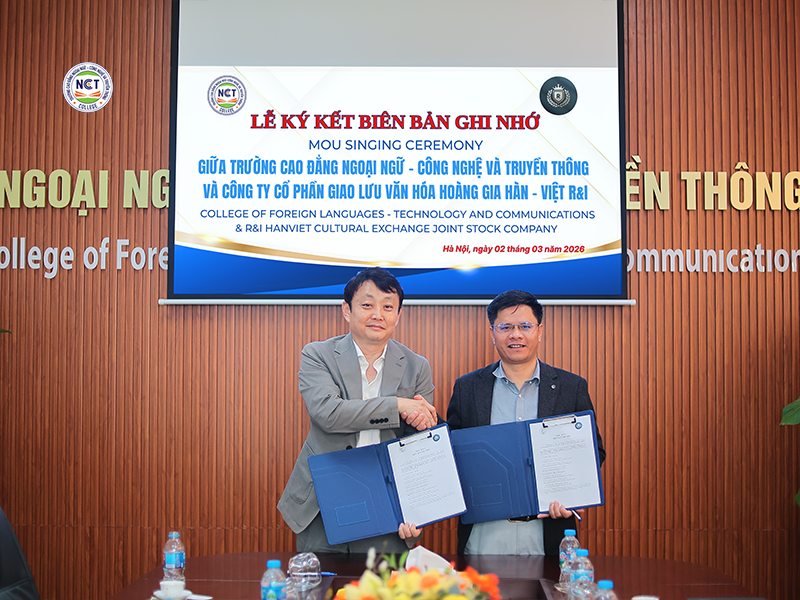 Chiều ngày 02/03/2026, Trường Cao đẳng Ngoại ngữ – Công nghệ và Truyền thông (NCT) đã ký kết Biên bản ghi nhớ hợp tác (MOU) với Công ty Cổ phần Giao lưu Văn hóa Hoàng gia Hàn – Việt R&I. Sự kiện đánh dấu bước tiến quan trọng trong chiến lược đẩy mạnh hợp tác quốc tế của Nhà trường, đặc biệt trong lĩnh vực đào tạo tiếng Hàn, giao lưu văn hóa và phát triển các chương trình hợp tác giáo dục Việt Nam – Hàn Quốc.