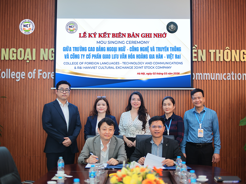 Chiều ngày 02/03/2026, Trường Cao đẳng Ngoại ngữ – Công nghệ và Truyền thông (NCT) đã ký kết Biên bản ghi nhớ hợp tác (MOU) với Công ty Cổ phần Giao lưu Văn hóa Hoàng gia Hàn – Việt R&I. Sự kiện đánh dấu bước tiến quan trọng trong chiến lược đẩy mạnh hợp tác quốc tế của Nhà trường, đặc biệt trong lĩnh vực đào tạo tiếng Hàn, giao lưu văn hóa và phát triển các chương trình hợp tác giáo dục Việt Nam – Hàn Quốc.